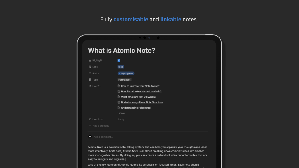 With this template, you can create notes on an atomic level, link notes to each other, and track the progress of each note. These features can help you stay organized and productive, and take your note taking to a new level.