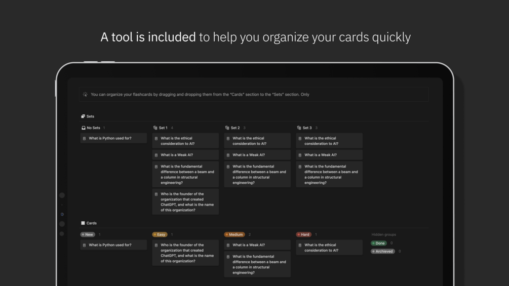 • The Flashcard Organizer function is designed for speed and efficiency. It enables you to create a flashcard set swiftly, making it easier for you to focus on learning.